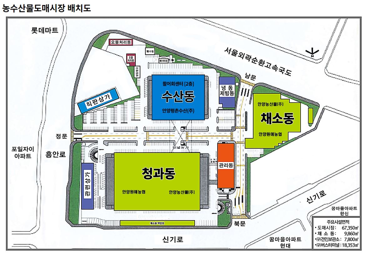 안양 농수산물도매시장은 크게 수산동, 청과동, 채소동으로 나뉩니다. 각각 동의 특성이 있기 때문에 입구에서부터 쉽게 구분이 가능하다는 장점도 있습니다. 휴무일은 각 동마다 다르니 참고하시기 바랍니다.