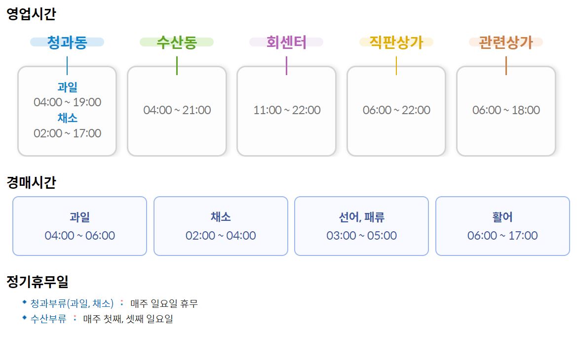 매주 일요일 휴무로 되어있으나 청과동 입구에선 소매상들이 과일을 팔기도 합니다. 영업시간은 청과동의 경우 저녁 6시, 채소동의 경우 저녁 8시로 비교적 늦게 닫습니다. 간혹 물건이 없는 경우 이보다 빨리 닫기도 하니 참고하시면 좋습니다.