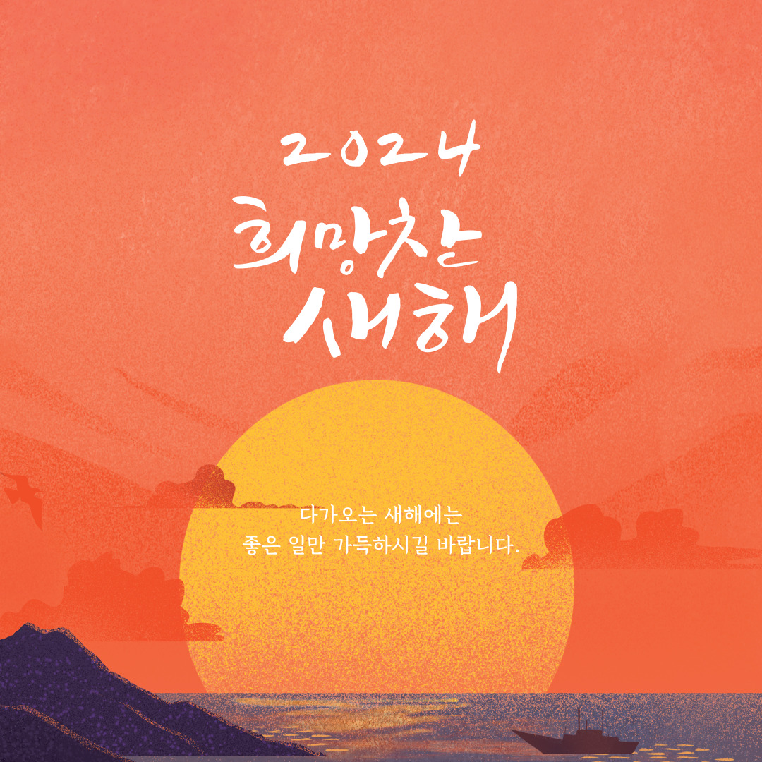 2024년 새해가 밝았습니다. 더 좋은 미래와 행복한 삶을 시작하는 한 해가 되길 바랍니다. 하시는 일 모두 형통하시길 바라며 가정과 건강에 행복이 넘치길 바랍니다. 올 한 해도 잘 부탁드립니다.